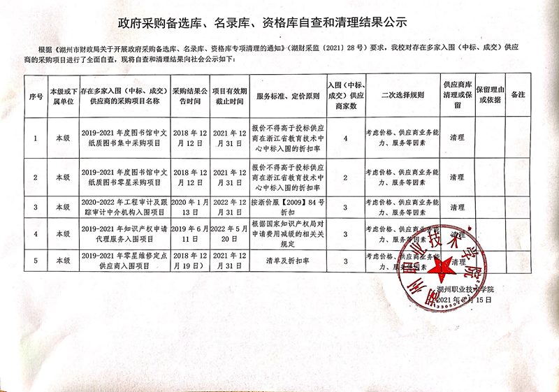 根据《湖州市财政局关于开展政府采购备选库、名录库、资格库专项清理的通知》(湖财采监〔2021〕28号)要求,我校对存在多家入围(中标、成交)供应商的采购项目进行了全面自查和清理,现将自查和清理结果向社会公示。
