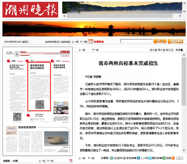2022年8月16日《湖州晚报》对我校招生录取情况进行了相关报道